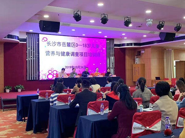 岳麓新闻网10月24日讯(记者 何丹 通讯员 罗琼)2019年10月24日上午,长沙市岳麓区0-18岁儿童营养与健康调查项目启动暨培训班在金枫大酒店举行。长沙市卫生健康委党组成员、副主任吴敏泉、长沙市卫生健康委妇幼处副处长刘翔燕、长沙市妇幼保健院副院长贺骏、岳麓区卫生健康局副局长周燕等领导出席开班仪式,省市妇幼保健院项目组成员、调查点项目联系人及抽调的现场调查员近70人参加培训。