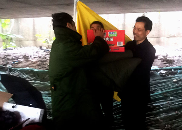 每到一处,李思远仔细了解流浪人员的实际困难和生活所需,认真向他们宣传救助政策,声明了“自愿求助、无偿救助”的工作原则,向他们发放棉被、大衣、棉鞋、棉袜、方便面、矿泉水等御寒物资和食品,同时递上救助小卡片,叮嘱他们吃饱穿暖,告知他们必要时向区救助站求助,并祝愿他们过上一个温饱祥和的春节。