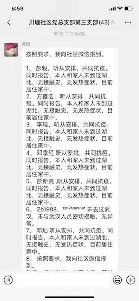 岳麓新闻网2月5日讯(通讯员 杨青 王彪)“按照要求,我向社区微信报到。听从安排,共同抗疫。同时报告,本人和家人未到过湖北,无接触史,无发热症状,目前居住在家中”“我住锦绣家园10栋205,原住户,长沙户籍,我们全家春节一直在邵阳老家,未去过疫区,也没有接触过疫区人”……