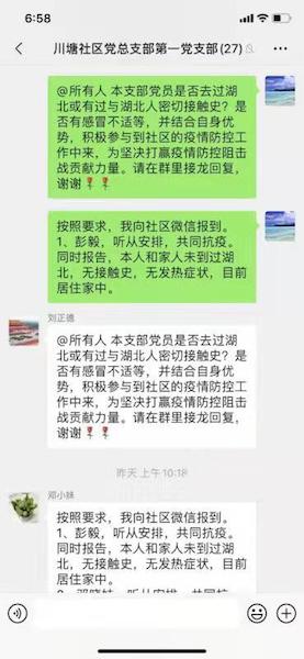 川塘社区党总支则创新党员管理工作方式方法,要求全体党员分支部从2月1日起在支部微信群进行“网上”报到,要求所有党员每天向支部微信群报备自己和家人的身体状况,是否有接触史、是否发热以及当前居住地点等情况,开展实时动态监测,让问题早发现早处理,引导党员减少外出。一个党员带动一个家庭,缩小疫情传播面,维护整个社区平安与稳定。
