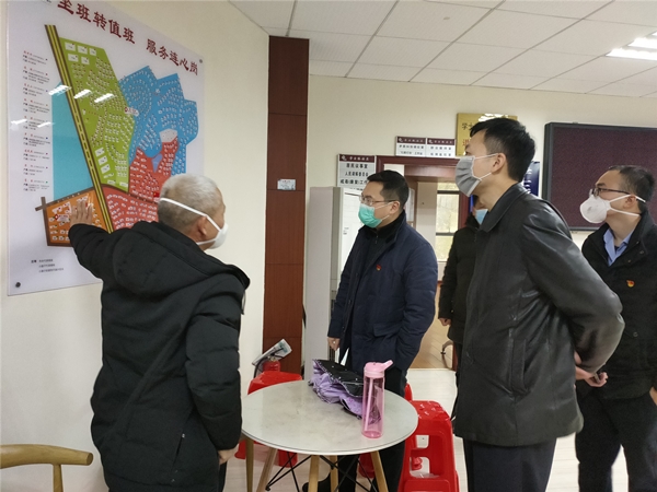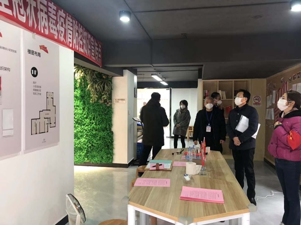 (在小区党支部新型冠状病毒疫情防控宣传点现场查看宣传情况)