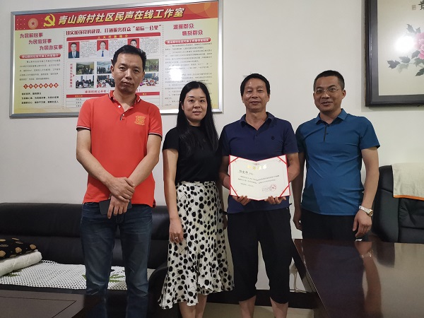 岳麓新闻网6月10日讯(通讯员 彭莹 褚瑄)“感谢您在抗击2020年新型冠状病毒肺炎疫情期间的慷慨捐款,您心怀大爱的善举我们将永远铭记于心,向您致敬!”2020年6月10日上午,天顶街道党工委委员、宣传委员、人武部长赵国亮,人大工委副主任王燕一行来到青山新村社区,向在新冠肺炎疫情中大行善举的居民彭建伟送上捐赠证书,感谢其在抗疫一线的辛勤付出和慷慨捐赠。