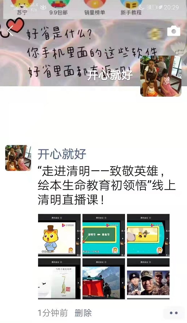 本次活动主要分为清明知识小课堂、绘本讲解、线上祭扫三部分。活动通过腾讯会议线上直播。首先,给参与者普及清明节小知识,紧接着为参与者讲解了一本关于生命教育绘本《当鸭子遇见死神》。故事的主角儿是一只快乐的、会给死神取暖的善良鸭子,和一个怡然的、会给鸭子用郁金香送葬的善良死神。他们都是乐天知命的。 “生命和死亡是一对密友,没有生命就没有死亡,而缺少了死亡,生命就失去了意义。”活动最后,在志愿者的指导下,学生们通过线上祭扫、点灯鲜花寄托对逝去的卫国英雄深表敬意与哀思。有些同学写了对英烈的寄语:缅怀先烈、立志勤学、爱我中华,让我们深深为之感动。