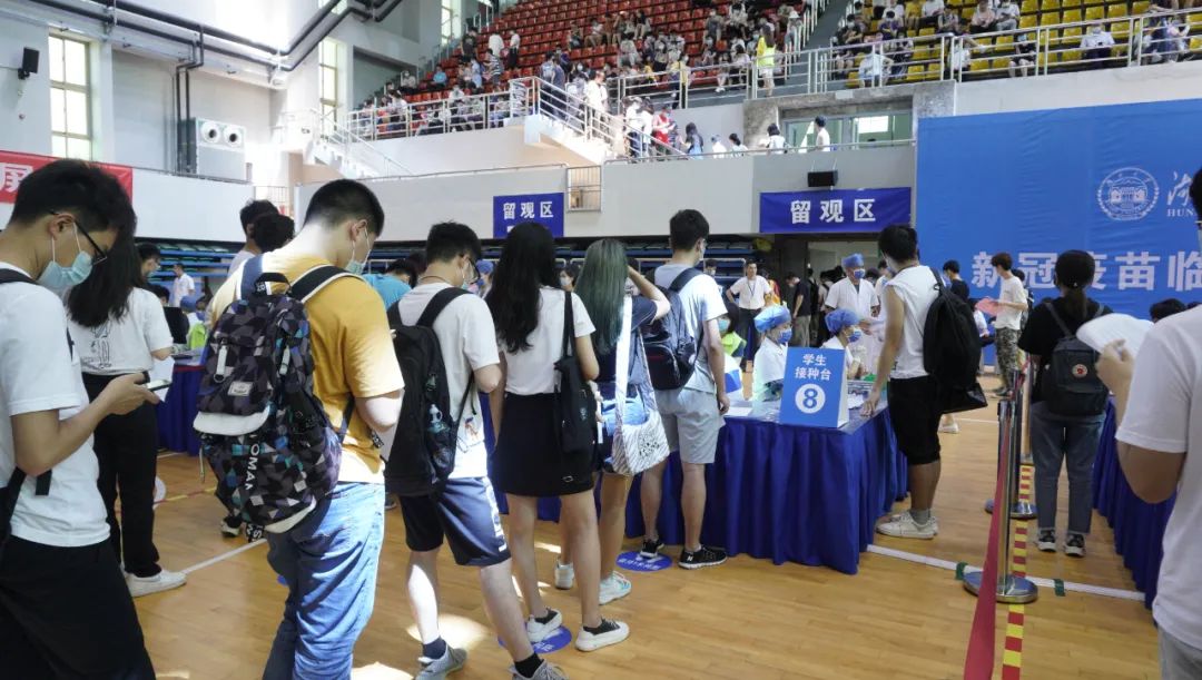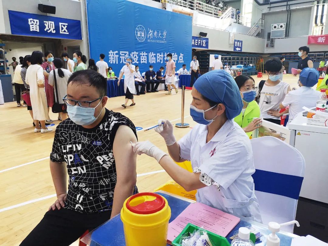 记者了解到,湖南大学新冠疫苗临时接种点是目前岳麓区规模最大的一个临时接种点。师生们戴口罩排队入馆后,先做健康筛查、核对信息,再接种、留观等待,整个过程不超过一小时。其中,疫苗接种时间一般就在几分钟内。