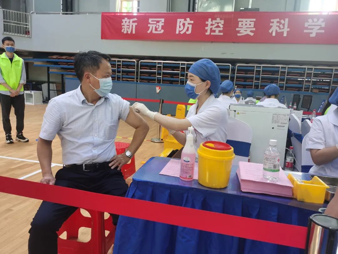 岳麓新闻网5月14日讯(记者 何丹)“接种后不要剧烈运动,不饮酒,清淡饮食、多喝水,适当休息......”5月14日,湖南大学在学校体育馆集中为师生开展新冠疫苗接种,在医务人员的嘱咐下,湖南大学校长段献忠完成了新冠疫苗第一针的接种。