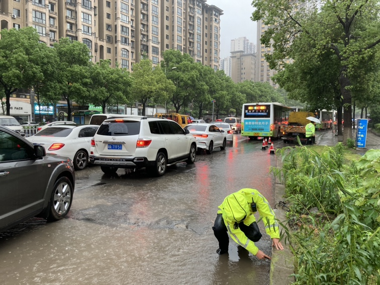 受暴雨影响,岳麓区桐梓坡路段积水严重,岳麓交警二中队中队长欧阳诚带领中队警力在现场一边疏导交通,一边弯下腰用手清理下水口淤积物。随后,中队的民警们借来铁锹、扫帚,他们一起清理排水口处的树叶等堵塞物,让路面积水迅速排出,也让该路段交通快速恢复正常。