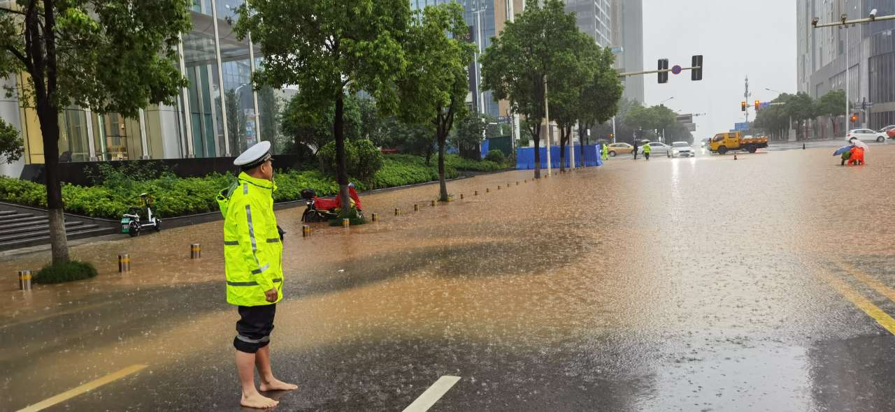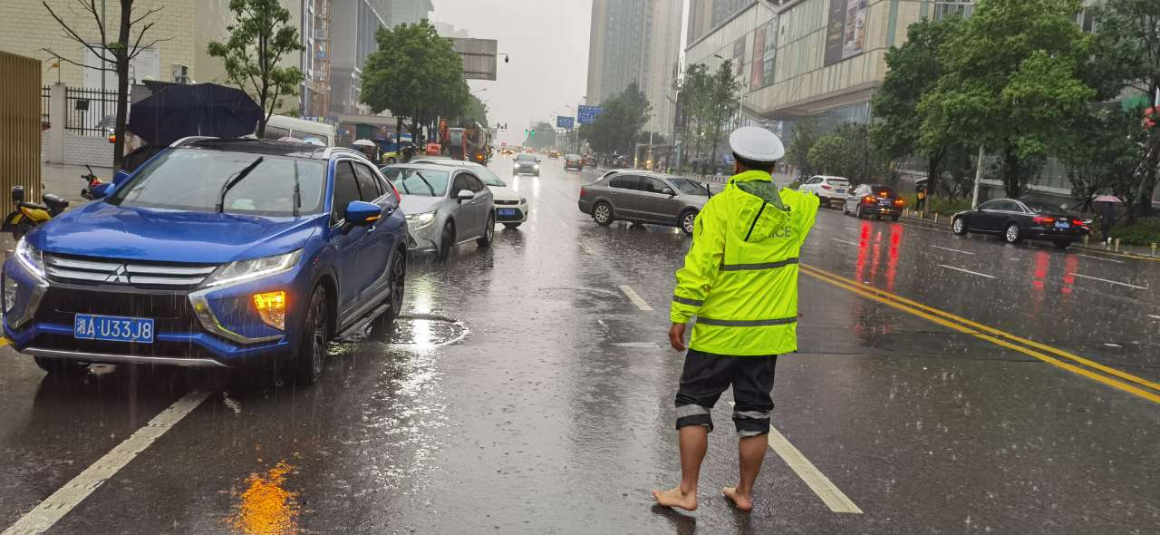 暴雨骤降,岳麓区潇湘大道茶子山路段积水严重,车辆无法通行。得知情况后,岳麓交警大队一中队指导员肖帅迅速带领中队警力开展现场疏导。由于积水较深,肖帅脱下鞋子、挽起裤腿,赤脚站在马路中指挥起交通,引导过往车辆安全通过,守护过往群众的交通安全。