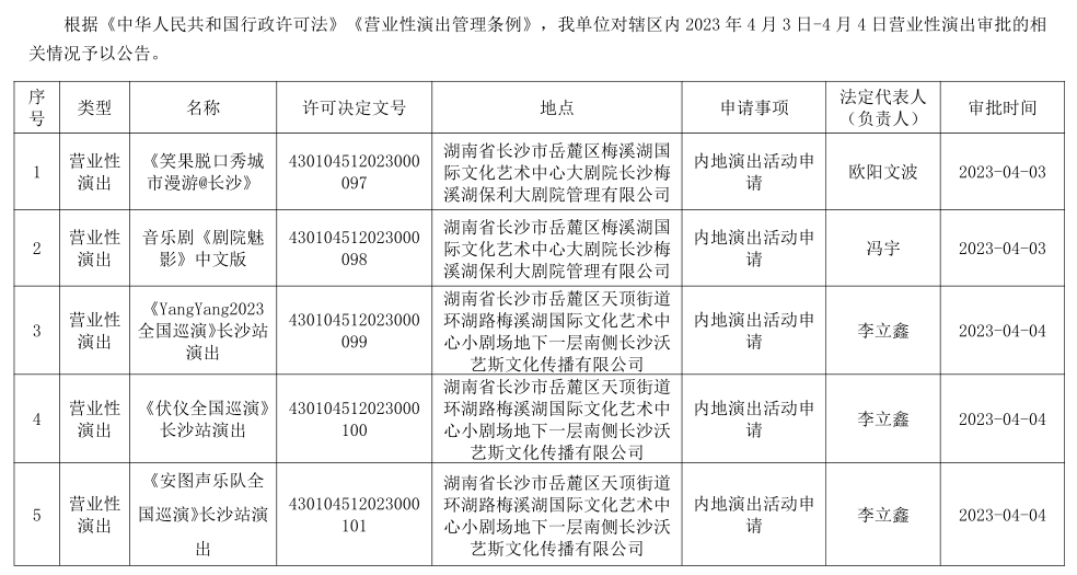 湖南湘江新区营业性演出行政许可事项公示(2023.04.03-04.04)