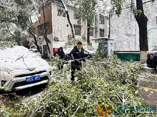 一夜醒来,社区干部们发现居民的车被埋在树下,有的甚至已经被“砸扁”。湘仪社区党总支立刻组织社区干部并协调辖区内环卫工、党员志愿者为最为严重的湘仪主路及洪江路进行扫积雪、伐断树行动。
